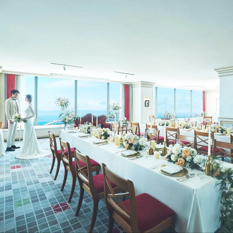 模擬披露宴ここでしか見られない神戸の景色が一望できる圧巻のロケーション会場、テラス隣接会場など、おふたりのお好みに合わせてご紹介。当ホテルならではのゆったりした非日常空間をご体感ください。